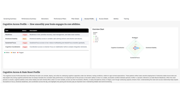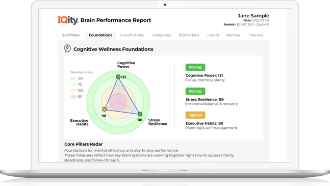 IQity is a cognitive optimization program designed to improve brain acuity, mental wellness, and long-term cognitive longevity. Built on decades of research in neurotechnology and cognitive science, IQity helps optimize brain performance today while supporting healthy cognitive aging. IQity delivers a holistic approach to cognitive readiness, using advanced neural metrics and real-time monitoring to assess brain performance relative to age, stress, and demand. These insights drive personalized brain training that targets weaknesses and strengthens cognitive function. The result is greater clarity, resilience, and cognitive vitality—because true longevity depends on a sharp, adaptable, high-performing mind.